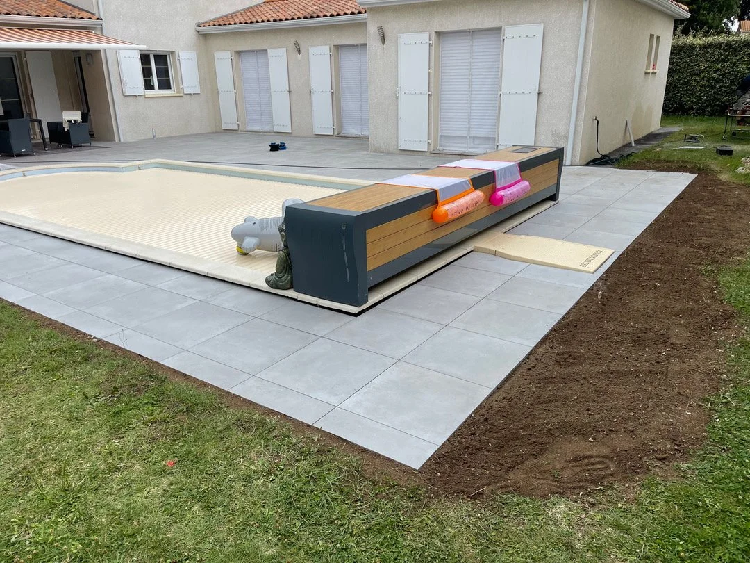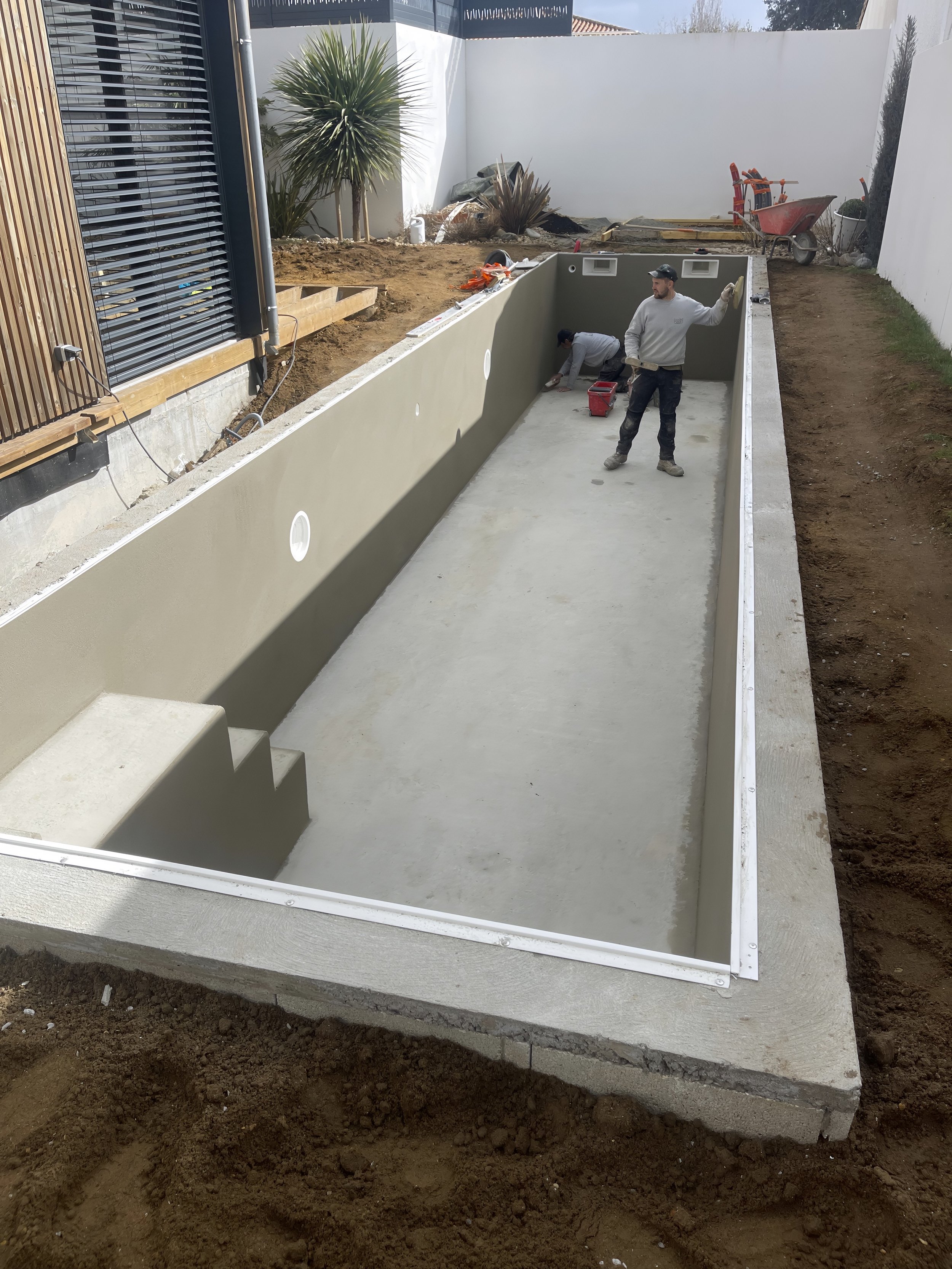Réalisation d'une piscine 12-5 avec volets immergés et réalisation banquette en béton