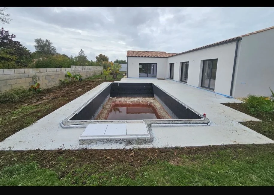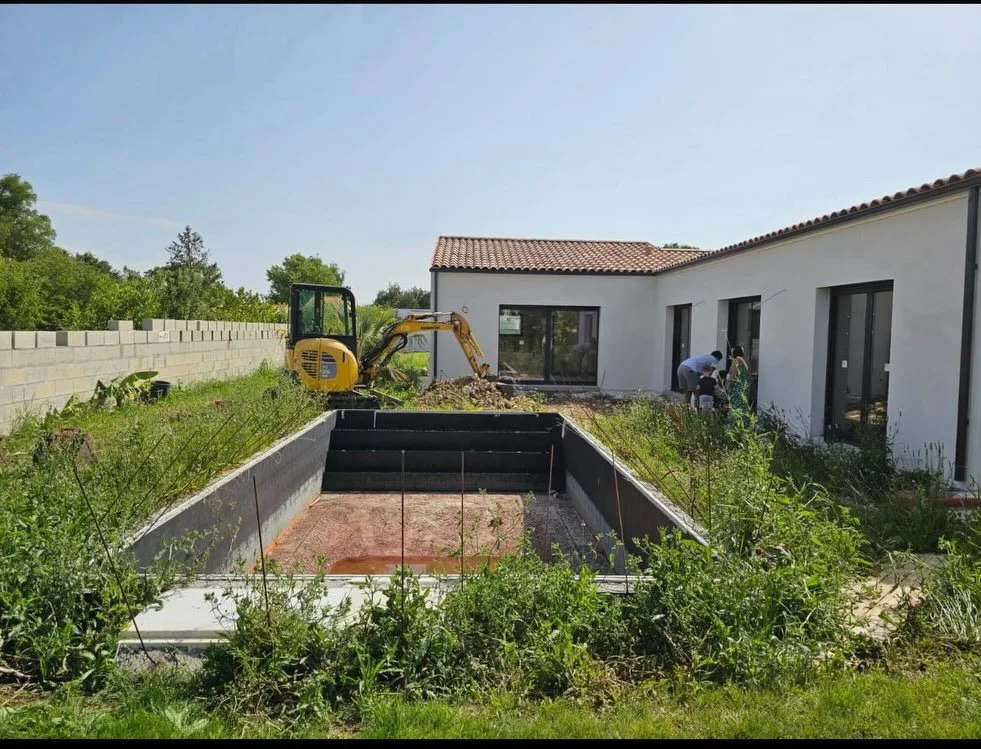 Travaux de construction d'une piscine avec murs en blocs de béton et renforts métalliques, dans un espace extérieur with arbres et maison en arrière-plan, sous un ciel clair.